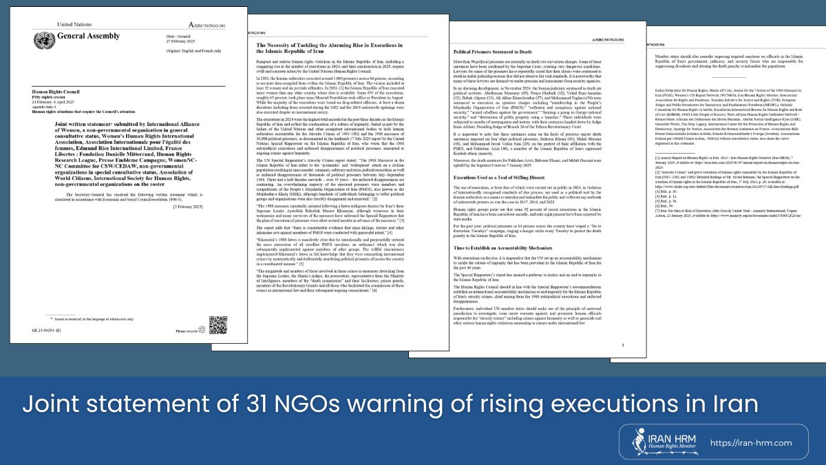 Rampant and serious human rights violations in the Islamic Republic of Iran, including a staggering rise in the number of executions in 2024, and their continuation in 2025, require swift and concrete action by the United Nations Human Rights Council.