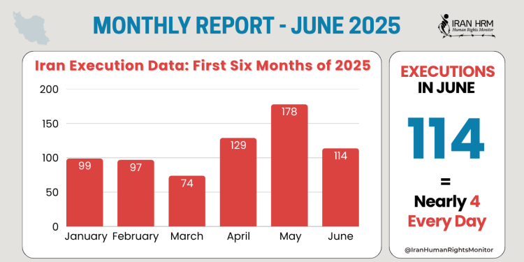 The Islamic Republic of Iran carried out a surge in executions during the month of June 2025, further solidifying its position as one of the world’s top executioners. A total of 114 people were executed, marking one of the bloodiest months of the year.