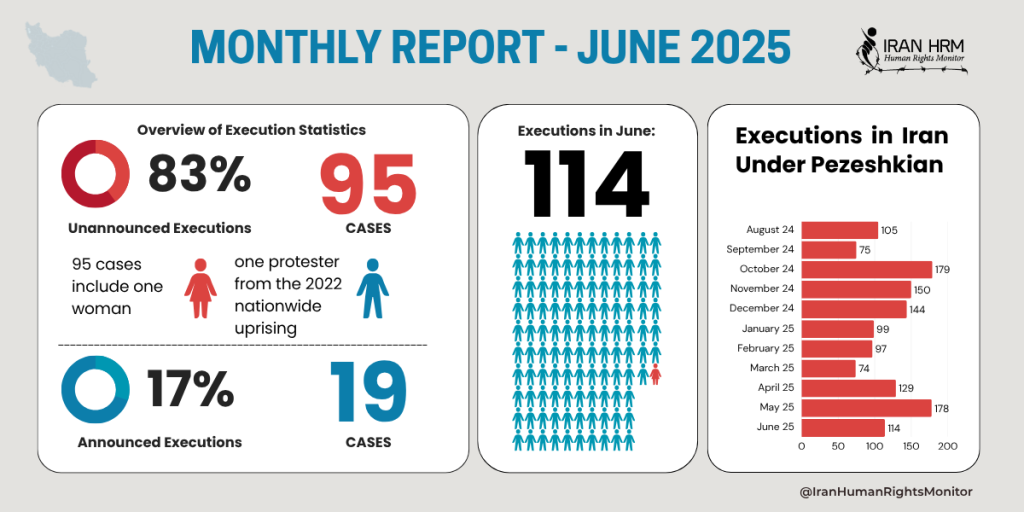 The month of June 2025 witnessed a sharp escalation in executions, mass arrests, inhumane prison conditions, and repressive measures targeting political prisoners and minorities in Iran. A total of 114 executions were carried out across the country, 95 of which were unannounced by the authorities. Six individuals were executed on espionage charges, and several acts of violence, torture, and forced disappearances of political prisoners occurred. The Islamic Republic continues its systematic use of the death penalty and arbitrary detention to suppress dissent and instill fear in the population.