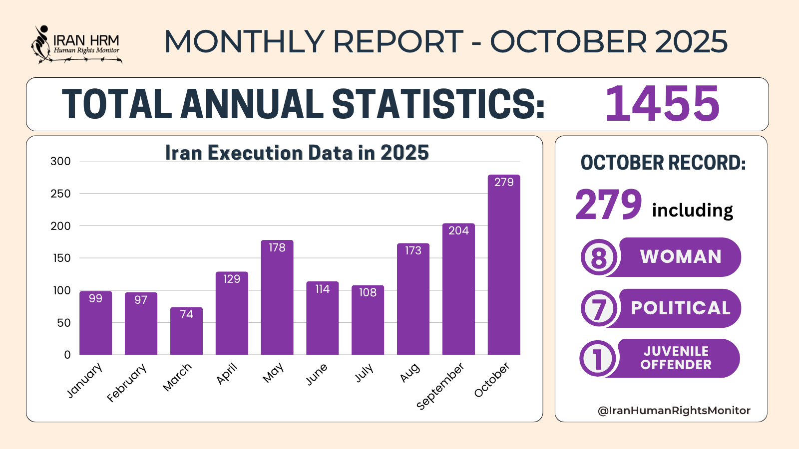 October 2025 saw an unprecedented escalation in executions across Iran, alongside intensified pressure on political prisoners, systemic medical neglect, and nationwide prison protests against the death penalty. Documented executions reached at least 279 for the month of October—an historic monthly high in recent decades—bringing the recorded total to 1,455 in the first ten months of 2025. The month included executions of 8 women and juvenile offenders, public hangings, and seven political prisoners executed on 4 October in Ahvaz and Karaj. Families of death-row prisoners repeatedly protested in Tehran, while about 1,500 death-row prisoners in Qezel Hesar Prison undertook a multi-day hunger strike demanding an end to executions.