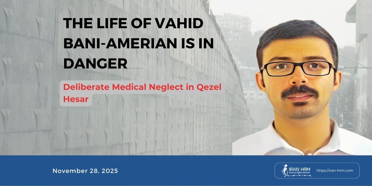 According to credible information, on Wednesday, 26 November 2025 (5 Azar 1404), Vahid Bani-Amerian was transferred to a hospital for an endoscopy and an eye examination. However, due to a lack of coordination between the prison and the medical staff, no physician was present, and he was returned to Qezel Hesar without any examination. Over the past two months, this marks the fourth such transfer with no medical outcome. This pattern of failed medical referrals persists despite his worsening conditions: severe gastrointestinal issues, respiratory infections, immune system weakness, and a sharp decline in vision. His visual deterioration worsened after he was beaten during transfer from Fashafuyeh Prison to Qezel Hesar, during which his eyeglasses were broken and have never been replaced. According to those close to him, this situation has caused persistent headaches and increasingly impaired daily functioning, reducing his ability to withstand harsh prison conditions.
