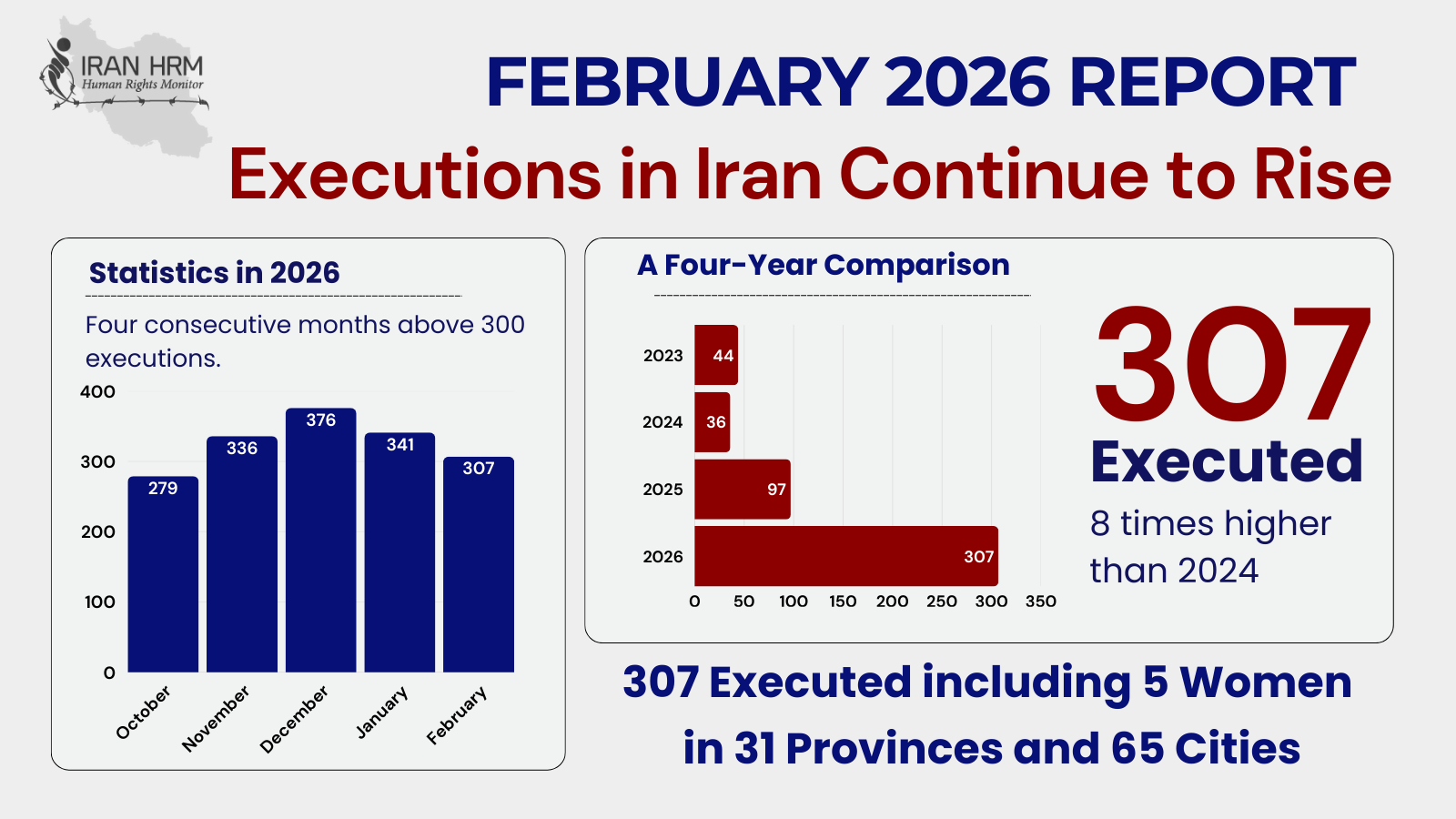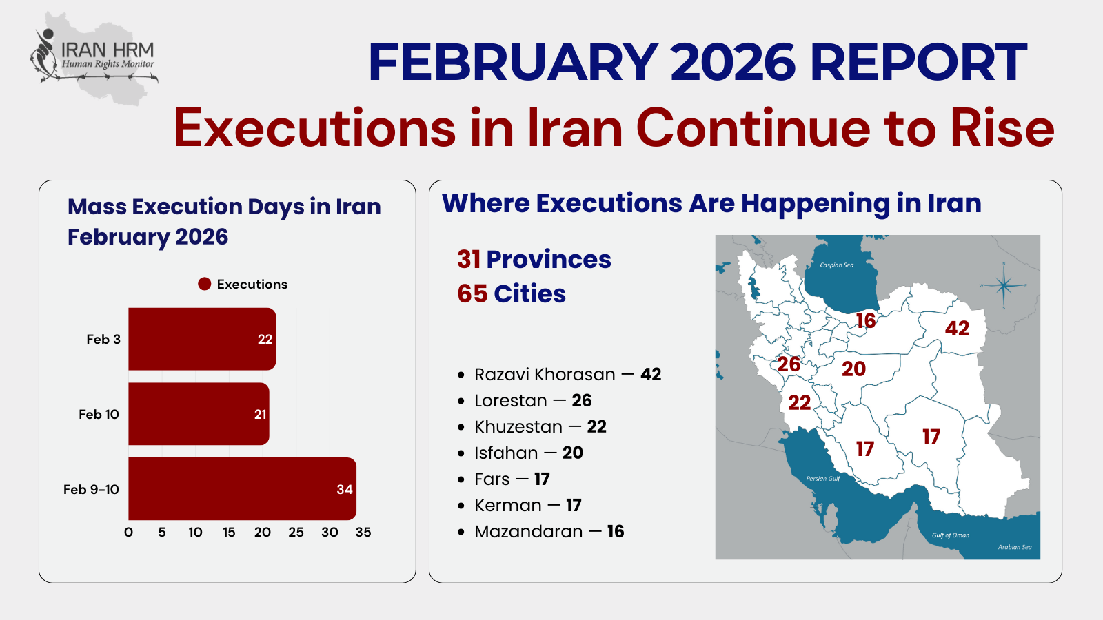 Iran HRM Monthly Report – February 2026 has been marked by an unprecedented surge in executions, a brutal crackdown on dissent, and the continued systematic use of torture and arbitrary detentions by the clerical regime. The regime’s persistent reliance on capital punishment as a tool for political repression and the instigation of terror has reached alarming levels.