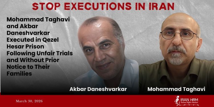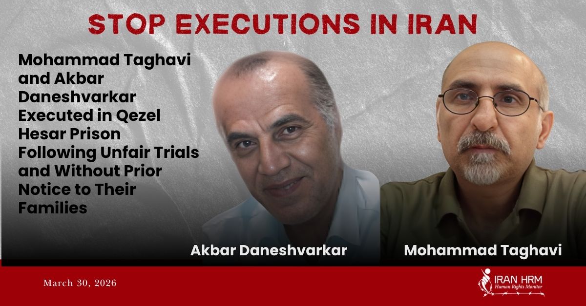 According to available reports, at dawn on Monday, 30 March 2026, two political prisoners, Mohammad Taghavi and Akbar Daneshvarkar, were executed in Qezel Hesar Prison. The news of the executions was published by a media outlet affiliated with the judiciary.