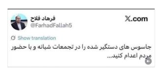 “Execute the arrested spies in nighttime gatherings with the presence of the people.” This anti-human demand for public execution was raised on the X network by Farhad Fallah, the Deputy of the Institute for the Intellectual Development of Children and Young Adults. The prescription of such violence by an individual whose affiliated institution is responsible for cultural education for children perfectly demonstrates how suppression, execution, and, in a word, crimes against humanity have become institutionalized within this government. Not only is it institutionalized, but the Islamic Republic seeks to transform these elements into a culture within society to eradicate any human sentiment, deeming any effort to keep it alive a crime and warning of its consequences. The prescription of such violence by an individual whose affiliated institution is responsible for cultural education for children is, beyond a political stance, indicative of a “systematic de-childing” of social ethics. The regime is effectively seeking to hollow out empathy from society and replace it with a “culture of hate and death,” where any human action is criminalized. However, the true danger of these statements is understood only when we decode who the regime labels as a “spy” or “terrorist.”